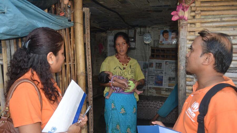 UNHCR staff members provide information on durable solutions to a mother in the Beldangi refugee camp in eastern Nepal.