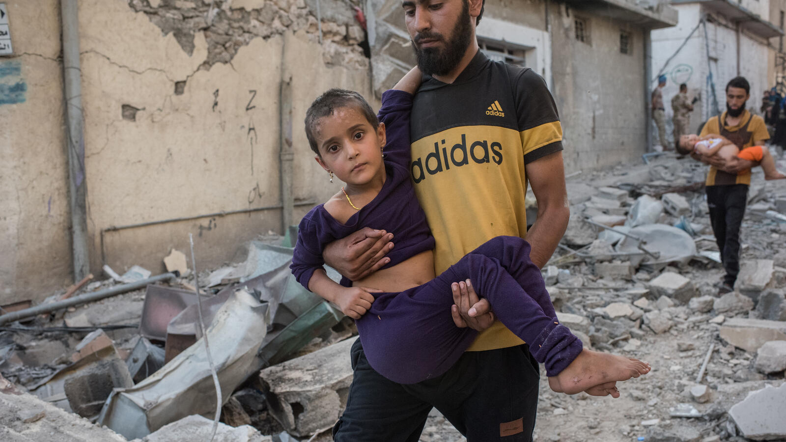 Two men carry sick and injured children to safety through the rubble of a street in the old city of Mosul on June 24, 2017.