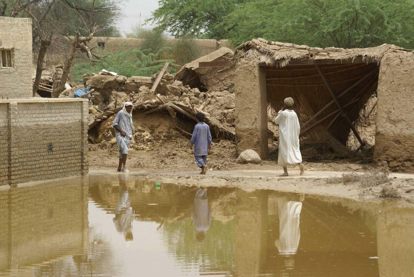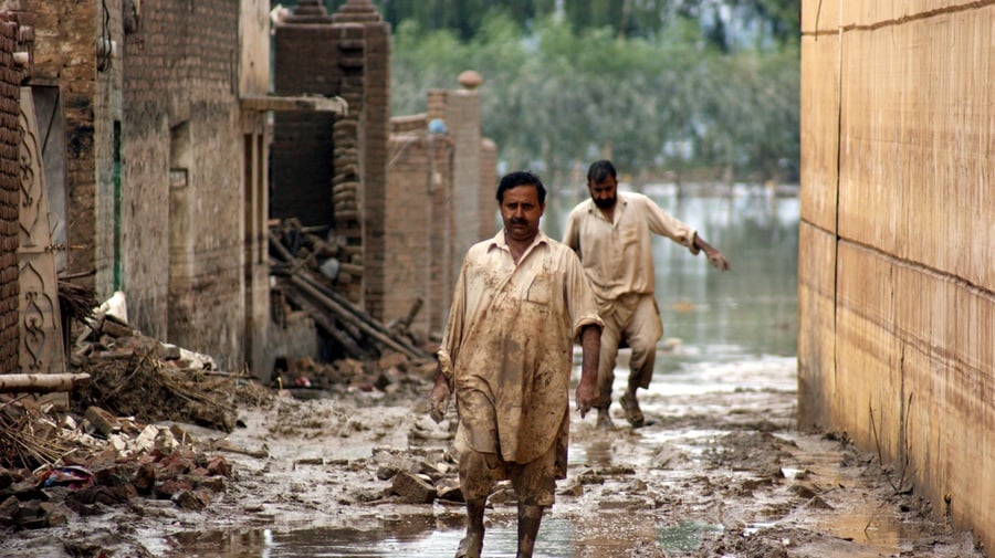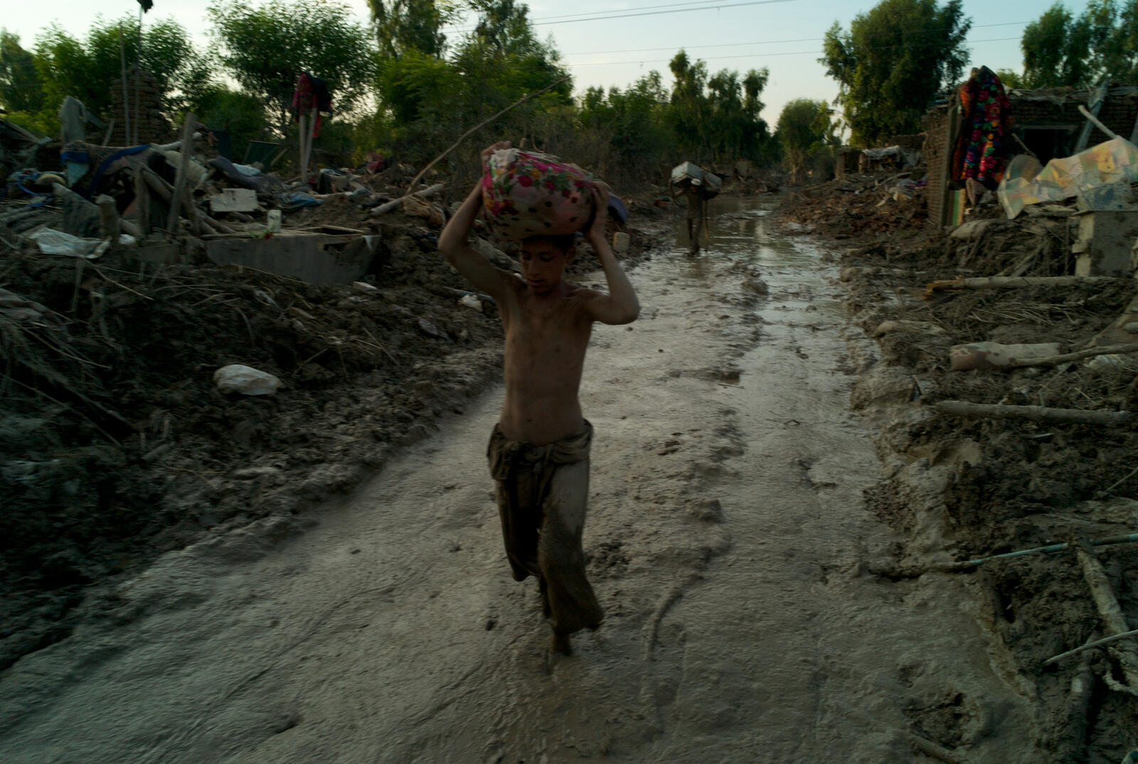 Flood survivors make their way through thick mud and debris outside of Peshawar.
