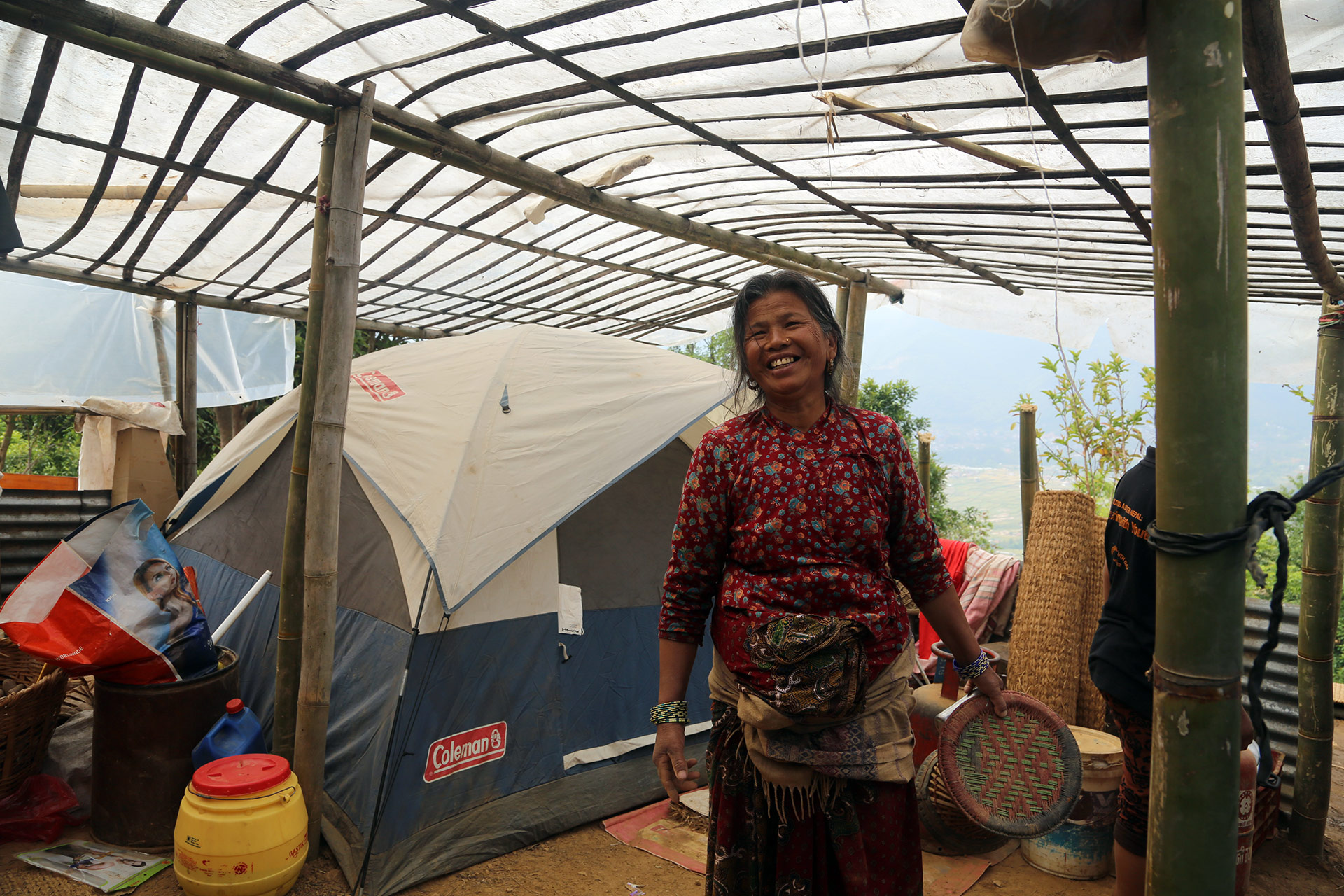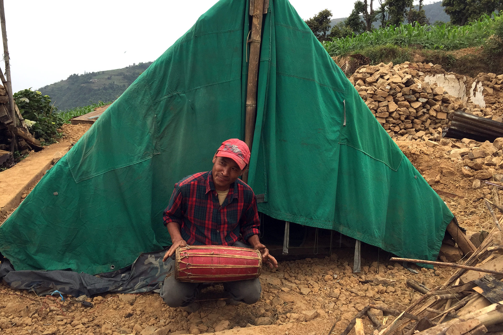 Jagat Thing, 42, is a short, wiry farmer with work-hardened hands and a laugh that inspires the village children to follow him around. When the earthquake hit, his family dashed out of the house and into the nearby cornfields. Jagat ran back into his crumbling home and pulled his elderly mother out by her legs. One of his two sons is a migrant worker in Malaysia. Since the quake Jagat has built two shelters: one for his animals and one for his family. A local NGO gave him a tent, and he managed to salvage the family's traditional drums, which he plays to entertain the children. He keeps a live turtle in his corrugated iron home for good luck.