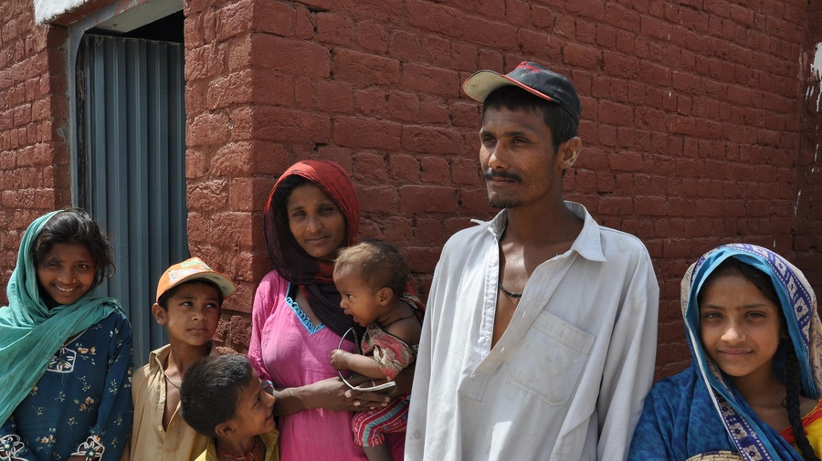 Zakir Hussain and his family stand in front of their new UNHCR-constructed home. The family belongs to Pakistan's Jam community, which traditionally lives in simple shelters along the banks of the Indus.