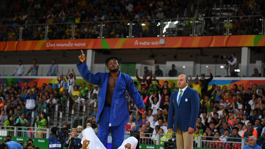 Popole Misenga celebrates the first-ever win of a refugee athlete in the Olympic Games.