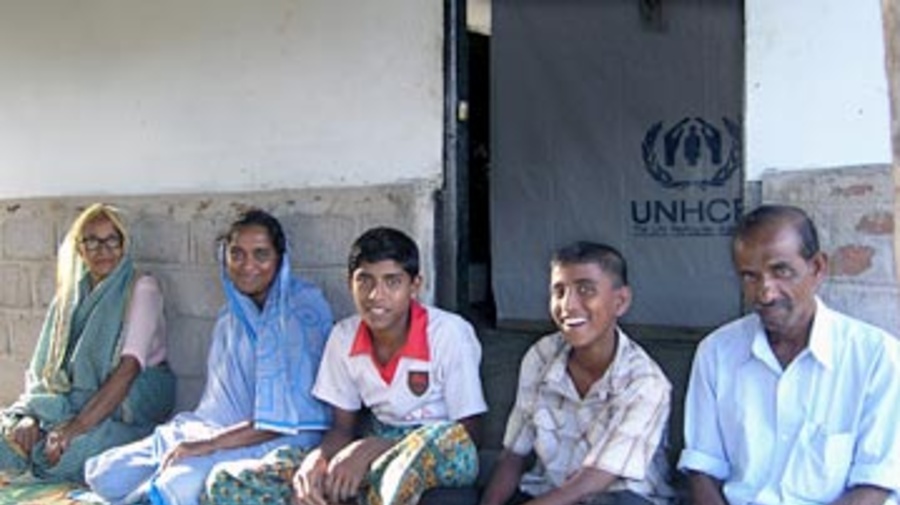 Mohamed and Faleela and family, reunited, outside their UNHCR transitional shelter in Ampara, Sri Lanka.