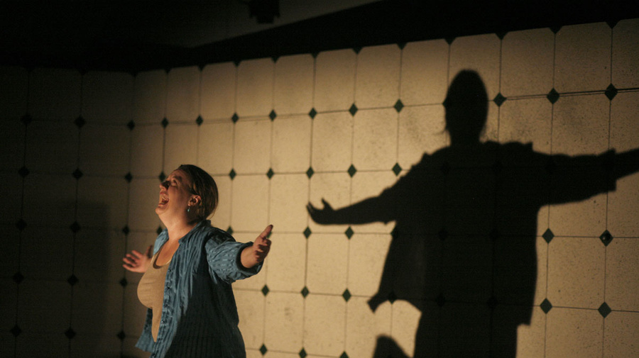 American playwright and actress Kim Schultz performs in a one-women show she wrote after meeting with Iraqi refugees in the Middle East.
