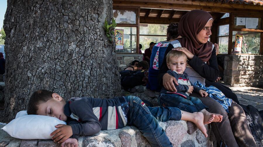 A refugee mother and her two children rest after arriving by boat on the island of Lesvos.