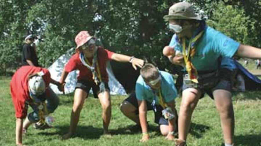Activity leaders wind lines of hand-holding, blindfolded scouts between tree trunks and guy ropes as they try to cross the border at night. Scouts must then decipher forms in a nonsensical script and negotiate with temperamental and disinterested border officials to get all their family members, even the 'sick' and 'injured', through to under-resourced camps on the other side.