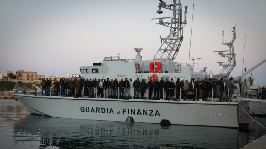 An Italian police vessel carrying people who were rescued from their foundering boat after setting off from Tunisia earlier this month in hopes of reaching Europe.