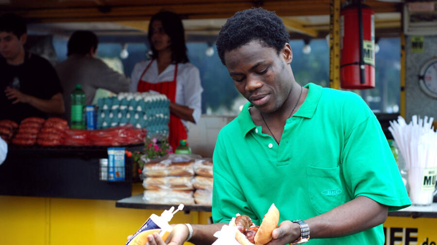 Nigerian refugee Davala enjoys an Argentinian hotdog on the street of his vibrant bohemian Buenos Aires neighbourhood, where he dreams of becoming a hip-hop star.