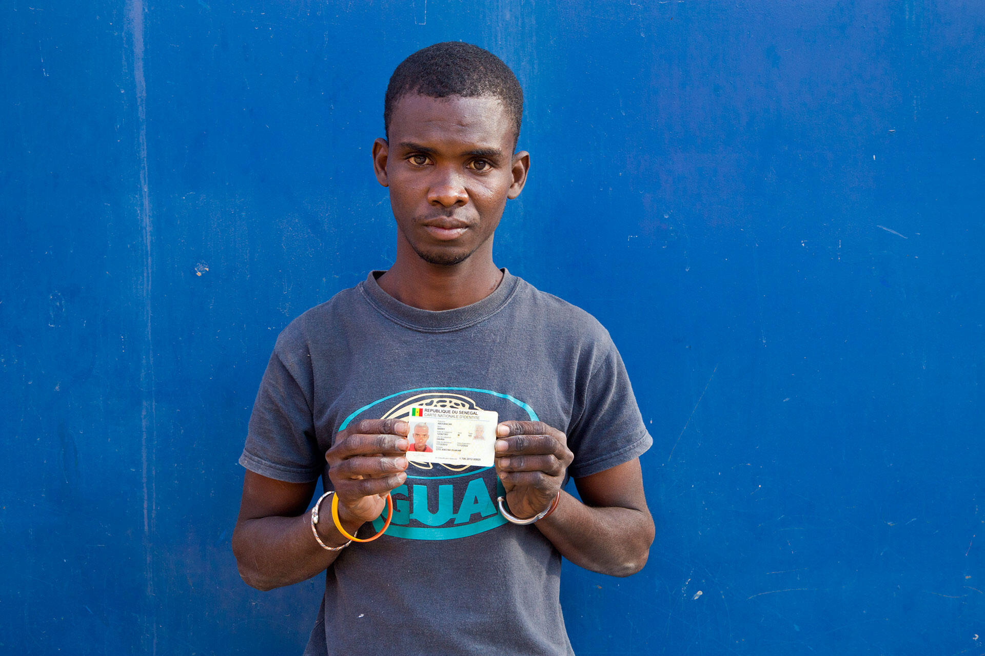 A former street child, Abou, 24, proudly shows his Senegalese ID card. "It has been a long way for me to finally feel more at peace and safe," he says.