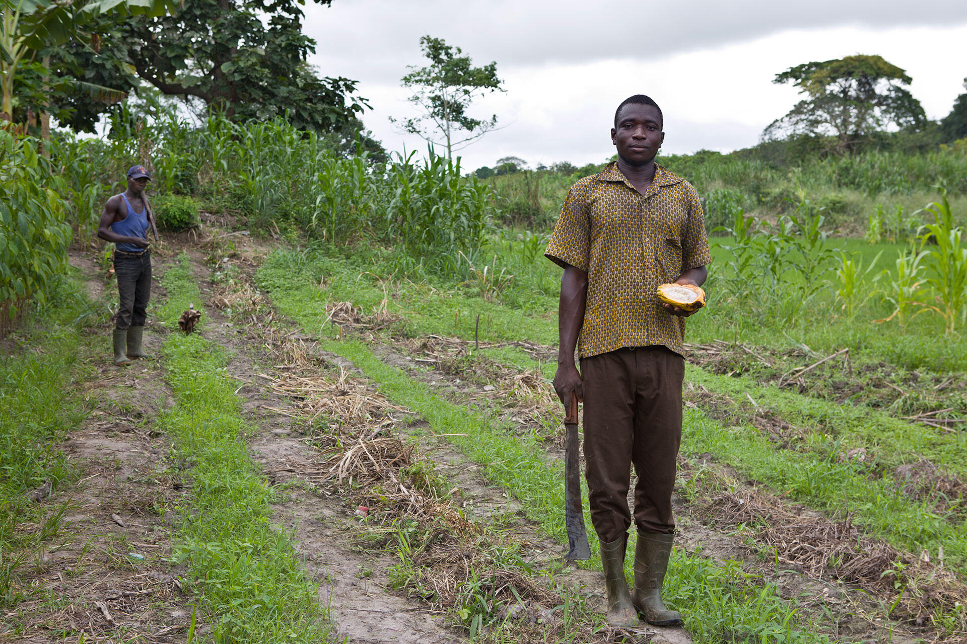 Mohamed, 17, stands in fields surrounding the small village of Saria, central Côte d'Ivoire. He was born in Ouagadougou, Burkina Faso, to Burkinabé parents who passed away when he was very young. His mother's older brother brought him to Côte d'Ivoire shortly after their death, and he has never returned to his birth village since settling in Saria.