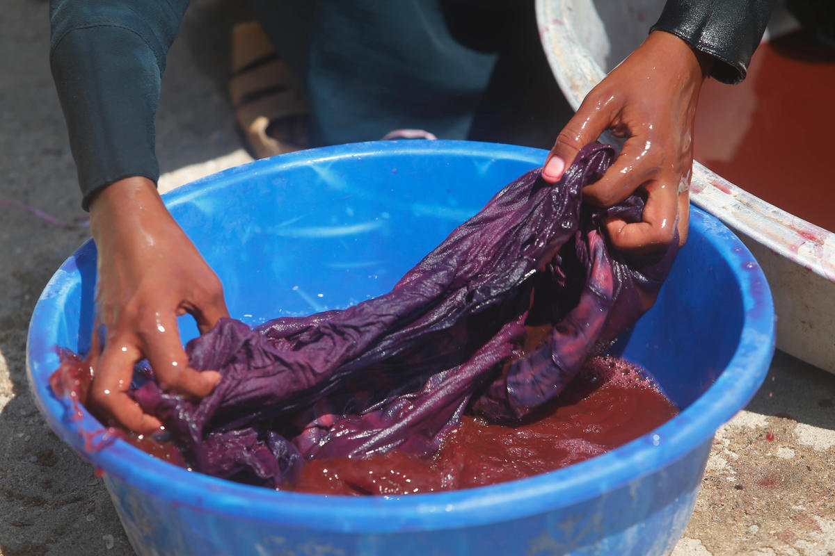 She soaks it in a mixture of salt, hot water and dye for a few hours and, after rinsing it, reveals a beautifully patterned cloth that she hangs out to dry. This is another of her intricately designed tie-and-dye fabrics that have made her renowned in Kismayo.