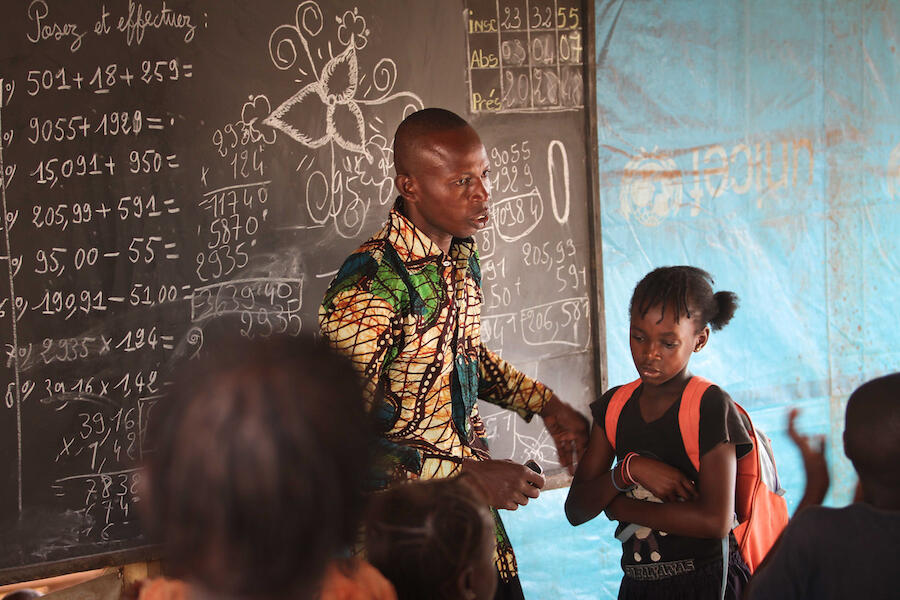 At the Grand Séminaire camp, now home to over 4,400 displaced people, Gildas has resumed his former occupation as a teacher. Equipped with little more than a blackboard and some chalk, he leads classes for 60 students seated on the floor.