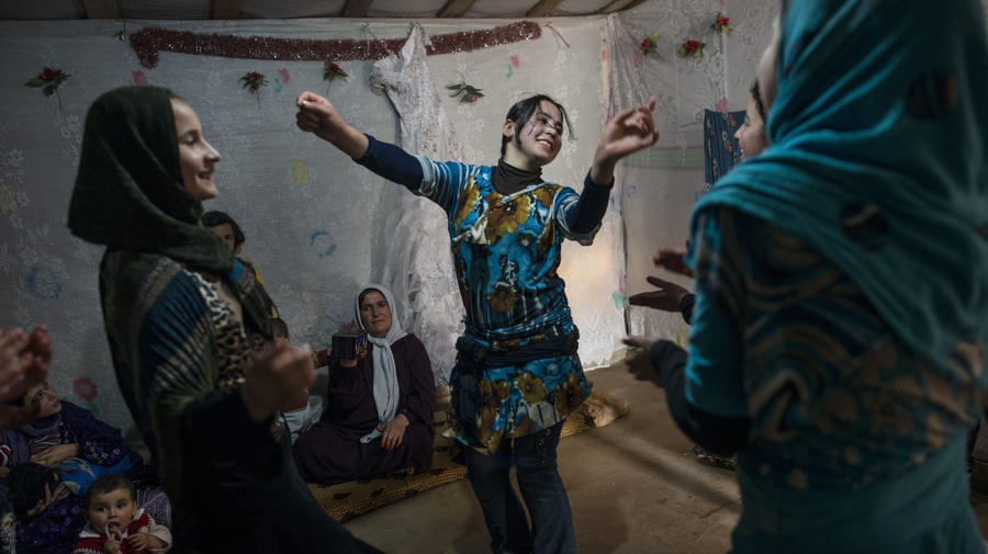 Female Syrian refugees dance at a wedding celebration in the informal Marj El-Khokh refugee camp, southern Lebanon.