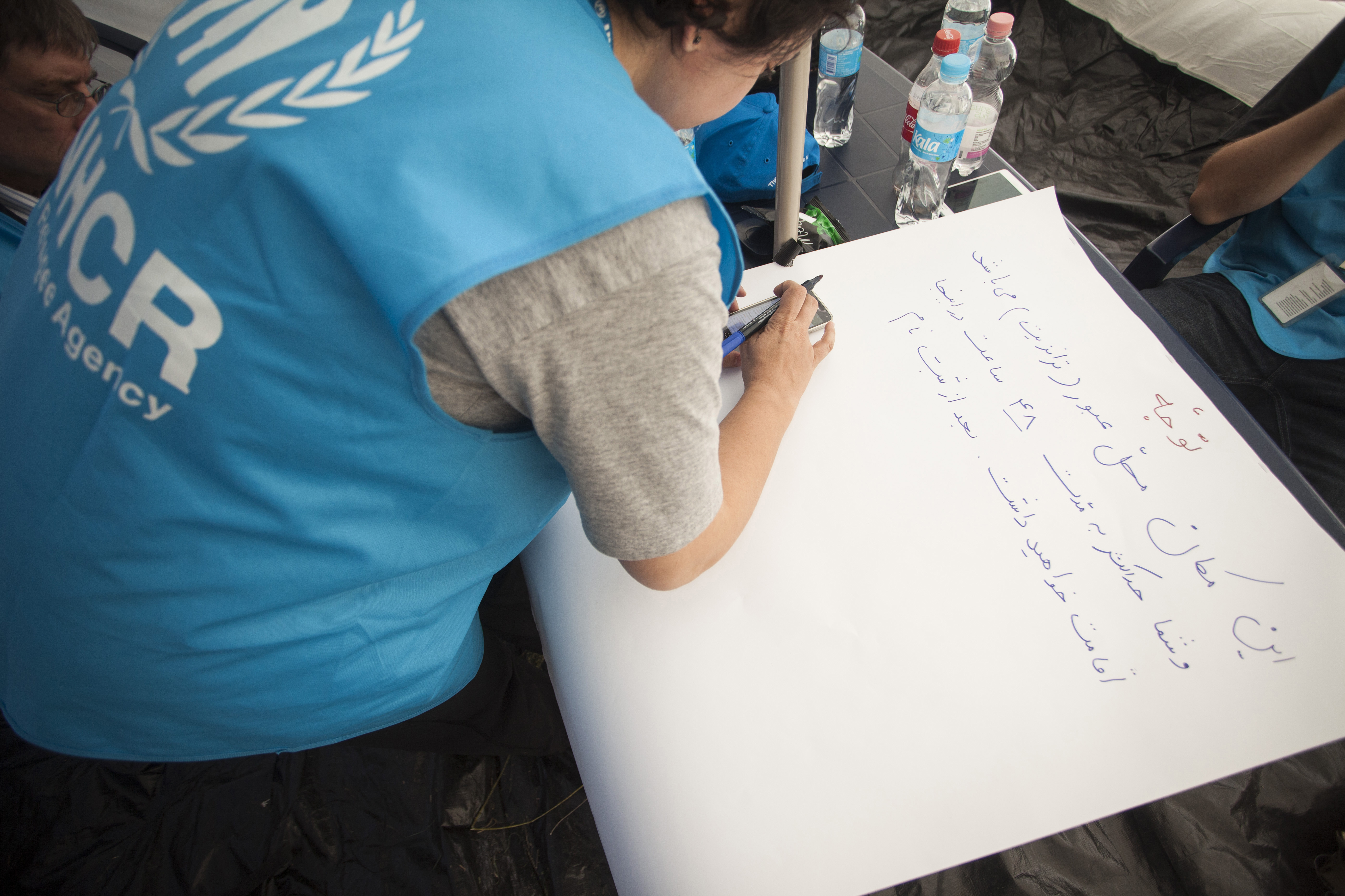 Mandana Amiri, UNHCR protection officer, writes an information poster in Farsi for refugees at the Croatian government transit center in Opatovac, near the Serbian border