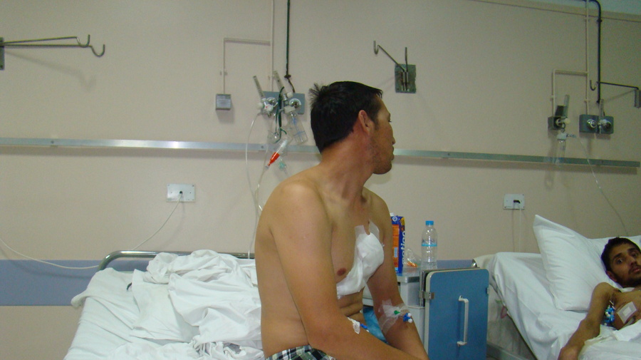 "They barely missed his heart," says his Afghan friend Ahat, keeping watch by his bedside along with Greek co-workers from the company where Aziz has worked for the last six years.