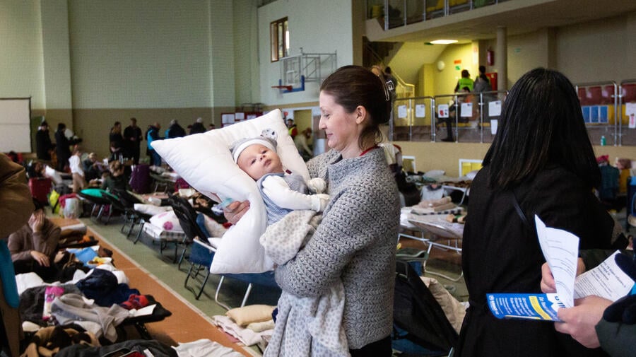 In a large sports hall in the Polish border town of Medyka, hundreds of camp beds cover the playing courts to provide temporary accommodation for refugees from neighbouring Ukraine. Amid the bustle and noise of families with young children, Valentina cradles her two-month-old nephew Andrii in her lap and tries to make sense of the past few days.