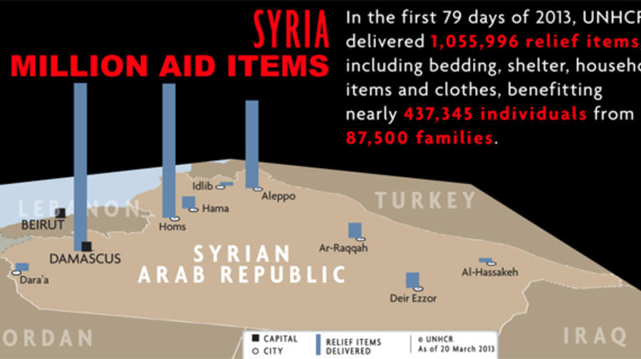 "Despite the security difficulties, UNHCR has been working to scale up its operations," Edwards said. "Since the start of 2013 we have had aid deliveries to Deir Ezzor, Dara'a, Raqqah, Idlib, and Hama. Last year we added to our existing presences in Damascus, Aleppo and Al-Hassakeh with new facilities in Al-Nabek and Homs. This has brought us closer to many of the centres of concentration of displaced and affected populations."