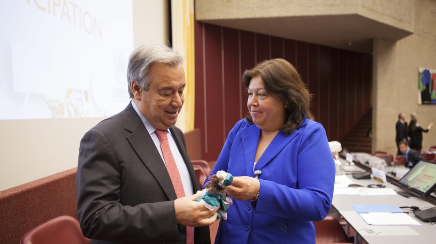 High Commissioner António Guterres receives a gift from Luz Mery Mesa of Asylum Access in Ecuador at the NGO consultations today in Geneva. Guterres talked of the importance of empowering women.