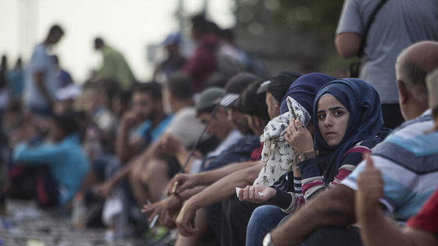 Young refugee women wait for a train at train station in Tovarnik, Croatia.