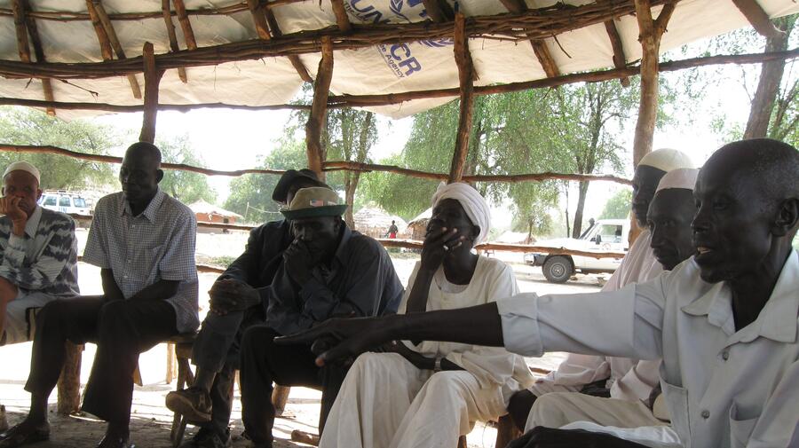 Locals and refugees discuss livestock grazing at a meeting facilitated by UNHCR in Maban County.