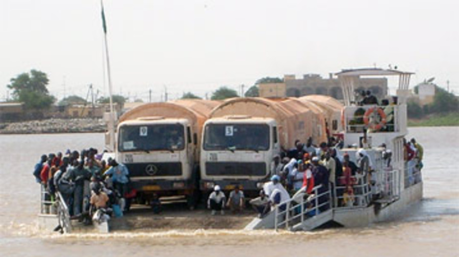 Almost at the end of their journey, UNHCR trucks cross the River Senegal on a local ferry.