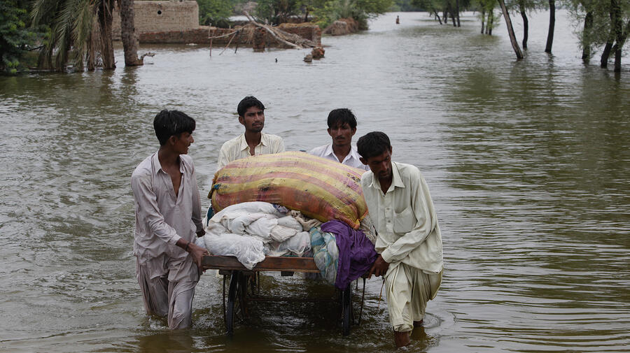 Villagers salvage their belongings on a pushcart while wading through flood waters in Sindh Province.