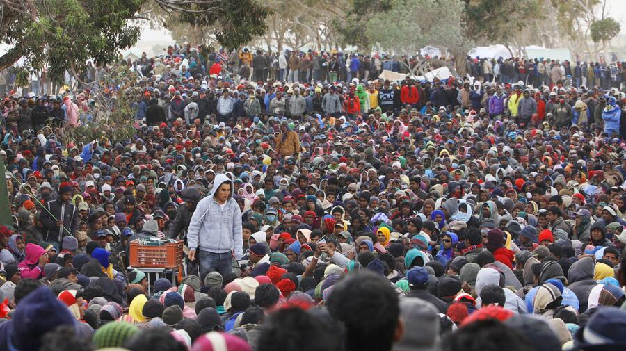 A crowd of mainly Bangladeshi migrant workers still waiting to leave the border area in Tunisia. Some have protested about their situation.