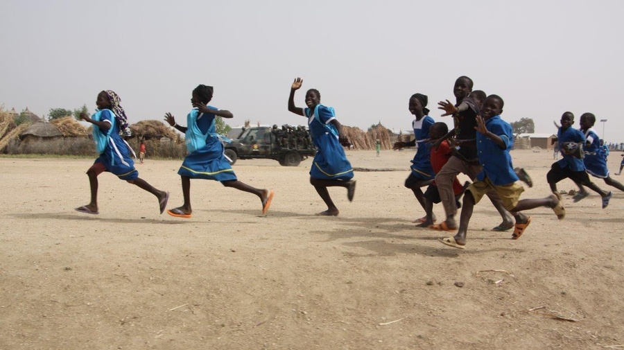 Young Nigerian refugees happily chase after visitors after attending a day of classes in northern Cameroon's Minawao camp.