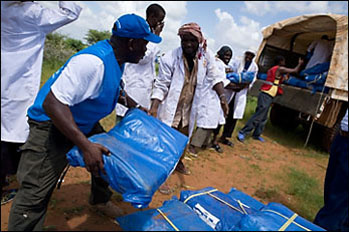 UNHCR staff and volunteers load supplies from the airdrop onto a truck at Dadaab.