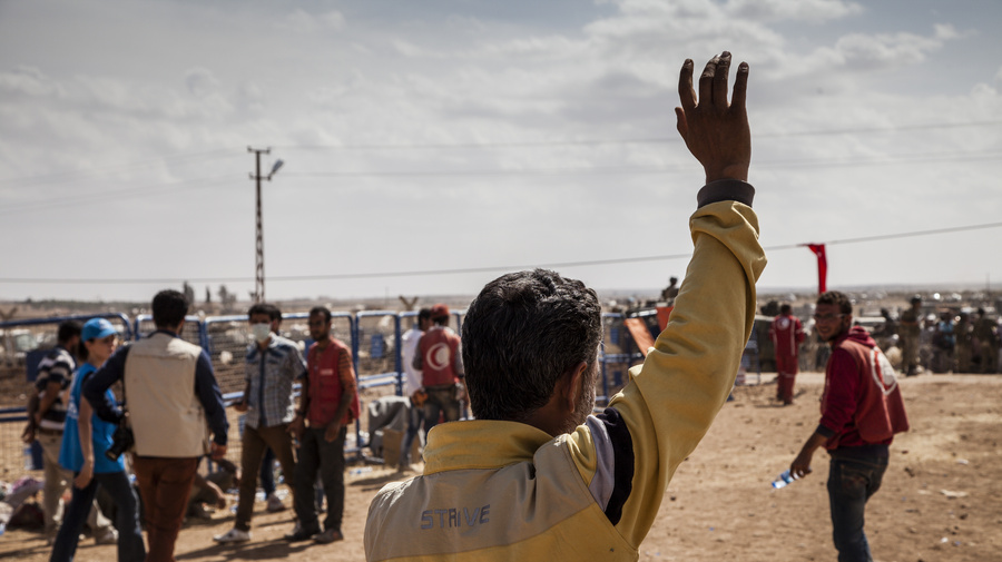 Faysal waves to relatives still waiting to enter Turkey from Syria.