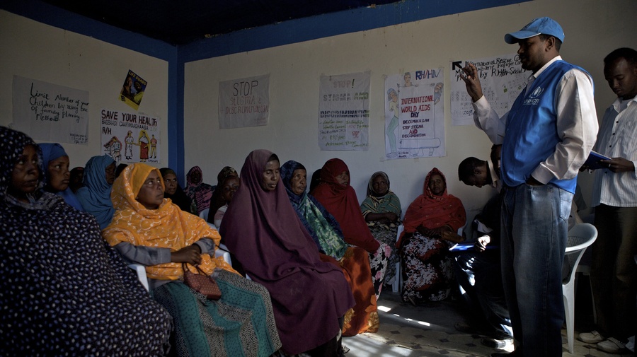 A UNHCR staff member leads an awareness session on HIV at a camp in Ethiopia.