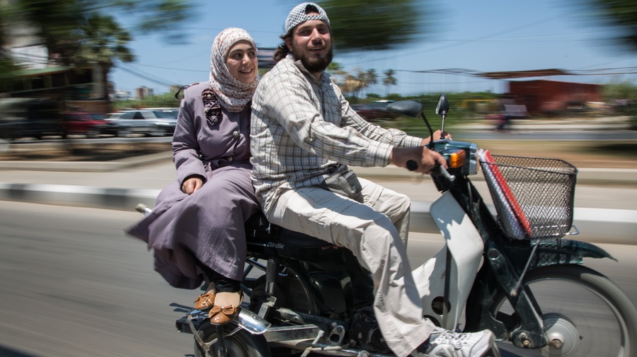 Ahmad and his wife, Nazmiya, leave a UNHCR volunteer meeting at the UNHCR offices in Tripoli, Lebanon.