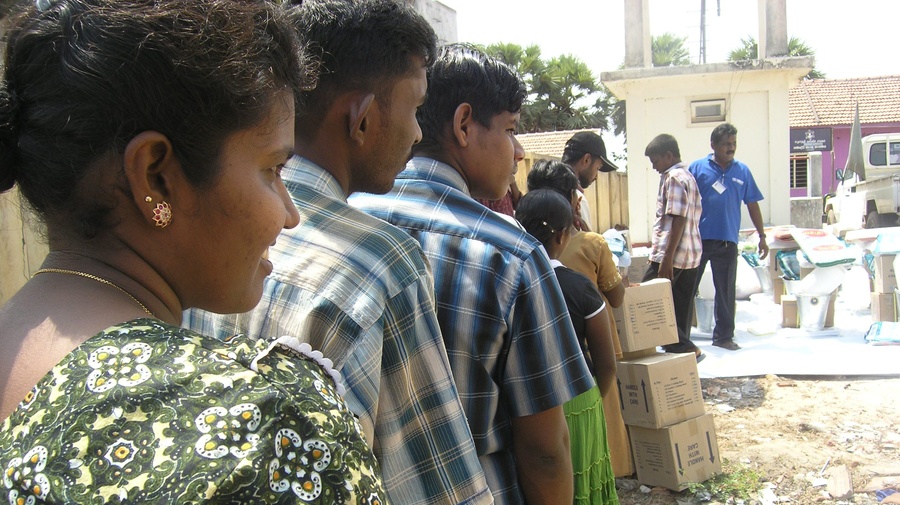 Former internally displaced civilians queue for non-food relief items in eastern Sri Lanka's Batticaloa district.