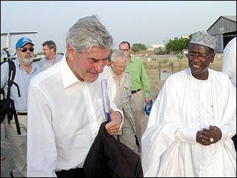 Arriving at the camp with a delegation of donors, he was greeted by rows of women and children who danced and sang in his honour. Refugee women wearing the brightly-coloured robes of their native western Darfur region presented him with a painted clay pot of red flowers, a generous gesture in an area where the vegetation is mostly limited to desert shrubs.