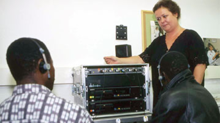 Asylum seekers in Geneva listening to recordings explaining Swiss asylum procedures.