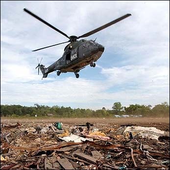 One of the Swiss helicopters hovering over the devastated town of Meulaboh shortly after its arrival in January.
