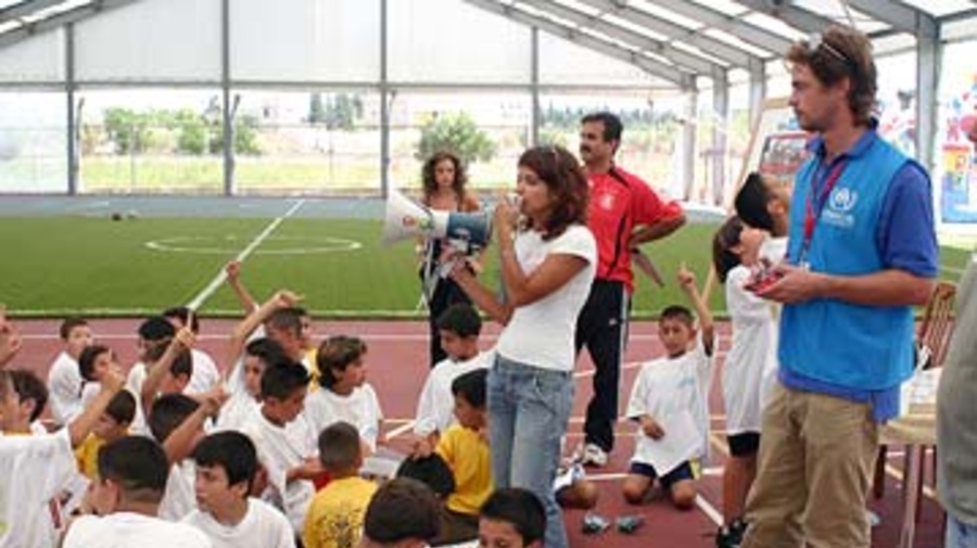 Children from villages near the southern Lebanese city of Tyre get a lesson on the dangers of unexploded ordnance as well as a fun day out at a sports centre.