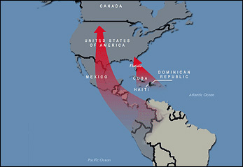 The broad migration routes from South America and the Caribbean to North America. Refugees and asylum seekers are found travelling these routes alongside irregular migrants.