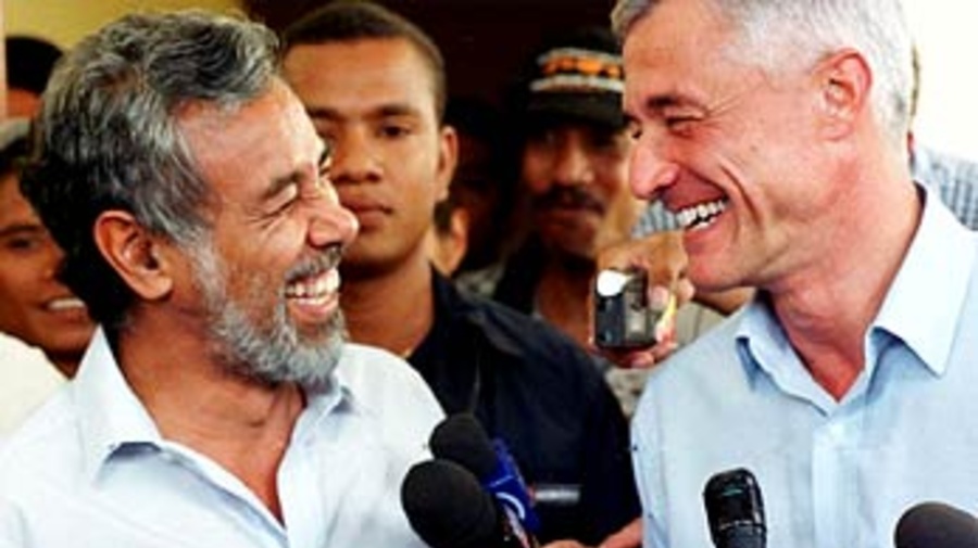 Steering East Timor towards independence: Sergio Vieira de Mello and East Timor President Xanana Gusmao during an April 2002 meeting in Dili.