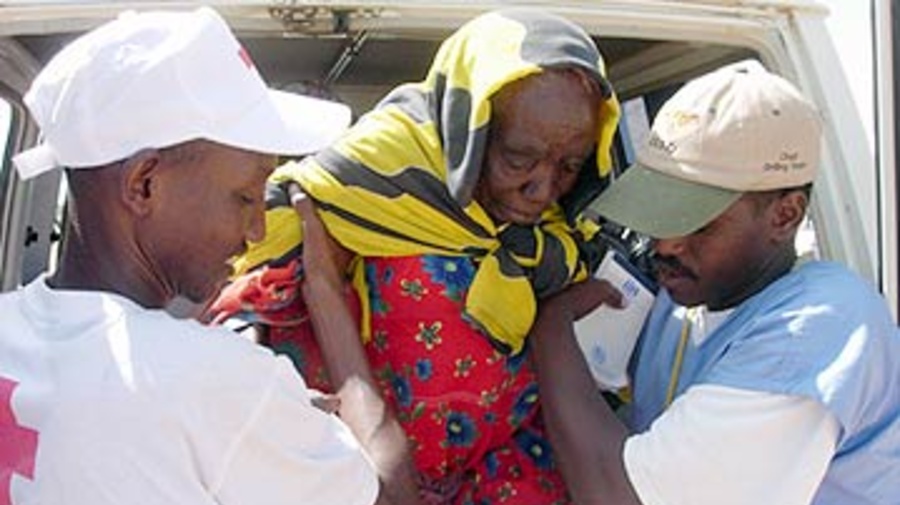 Aid workers assisting an elderly refugee from an ambulance after her arrival at Kounoungo camp in eastern Chad.