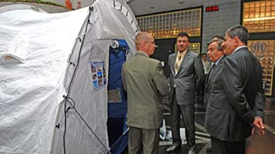 Prince Faisal Bin Abdullah Al Saud (with tie and yellow shirt) examines a lightweight family tent in the atrium of UNHCR headquarters in Geneva.
