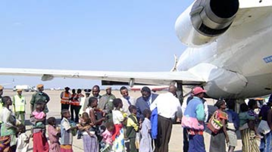 Angolan refugees boarding this year's first flight home from Zambia's Lusaka International Airport.