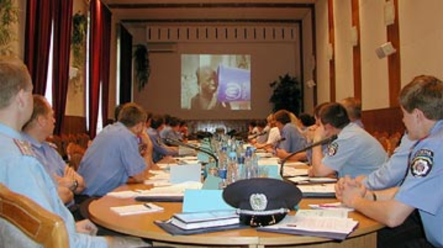 Kyiv's police officers watching a UNHCR video on refugees during the training session on 22 July, 2004.