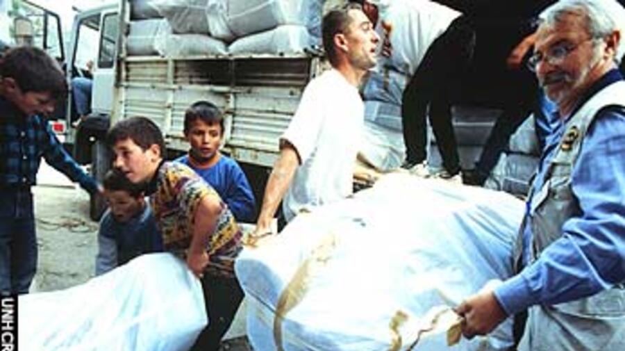 UNHCR staffer unloading return kits in Sipkovica village in the Former Yugoslav Republic of Macedonia