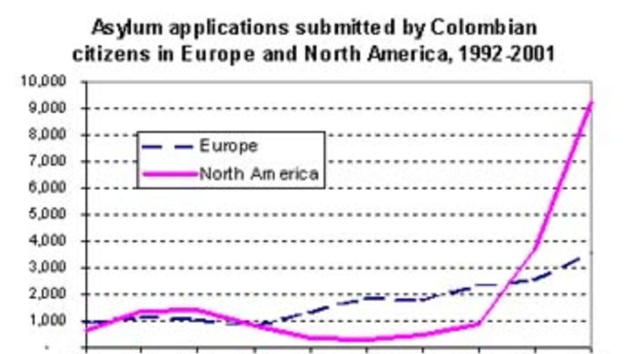 In Costa Rica, 5,018 Colombians appealed for refugee status last year, compared with 1,450 in 2000 and just 88 the year before. The trend is continuing, with 750 cases filed during the first two months of the year, a slightly lower rate than the monthly average of 430 cases filed during 2001.