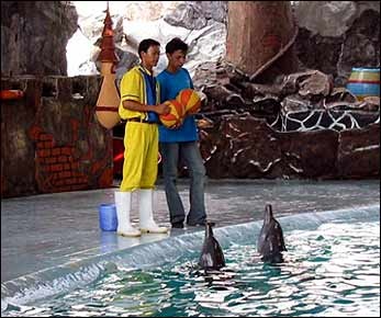 An Aghan refugee giving instructions during the dolphin show.