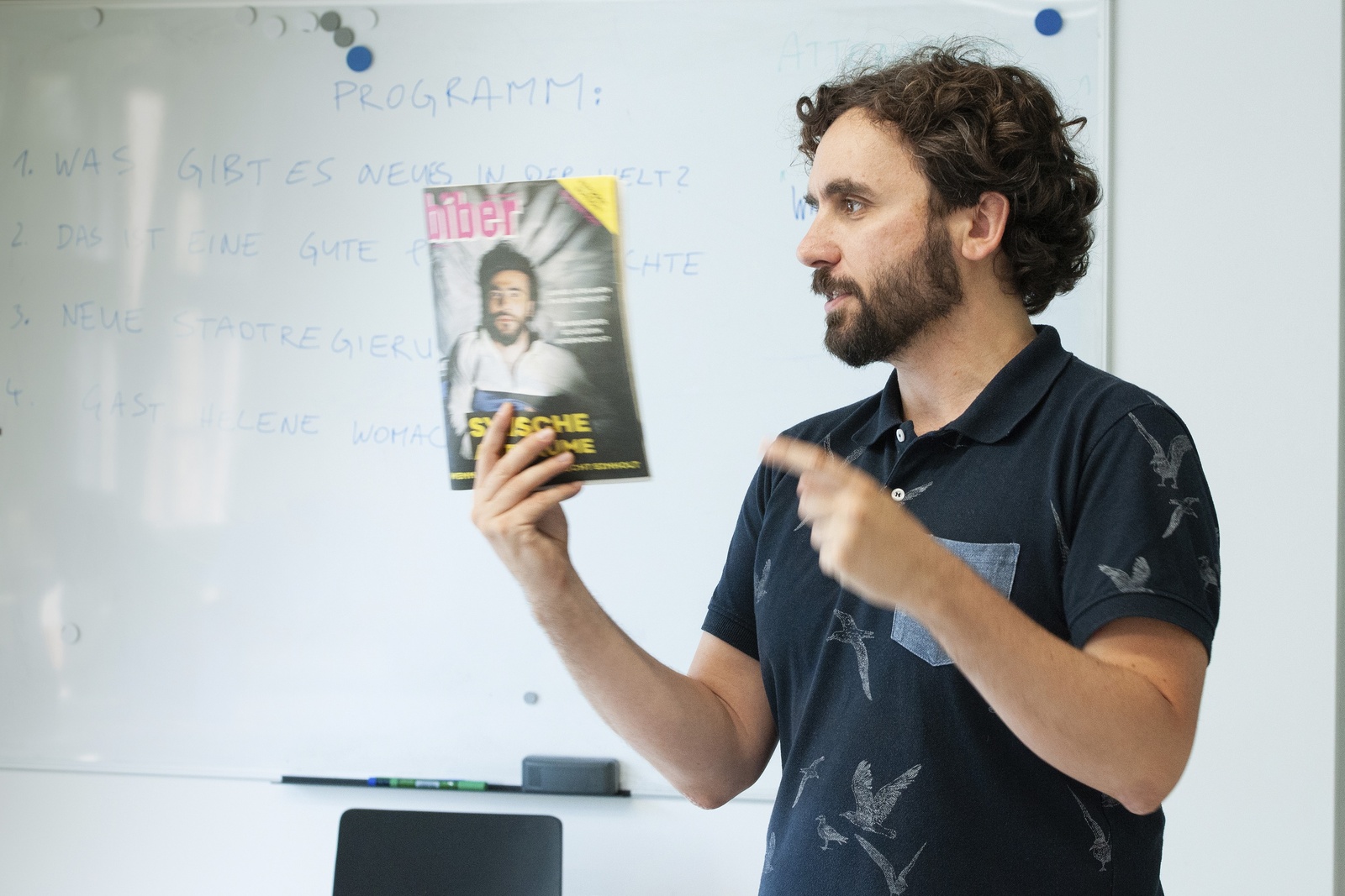 Rajkovic, 36, kam selbst im Alter von zwölf Jahren als Flüchtling aus Bosnien-Herzegowina nach Österreich. Er ist stellvertretender Chefredakteur bei „Biber“ und leitet den Kurs zusätzlich zu seiner journalistischen Arbeit für das Magazin. „Es könnte genauso gut ich sein, der hier sitzt“, sagt Amar Rajkovic. „Deshalb habe ich so viel Mühe in diese Kurse gesteckt. Ich habe viel Sympathie für die Flüchtlinge, ich kann es nicht abstreiten.“