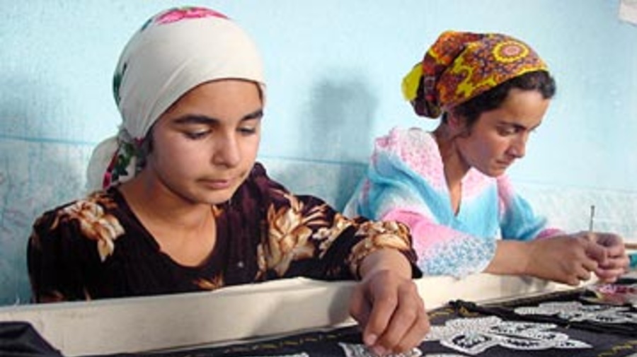 Orosta Valiyeva (left), 15, is learning embroidery under a joint UNHCR-WFP project in Dusti, Tajikistan. She hopes to earn $20 a month to help support her family.