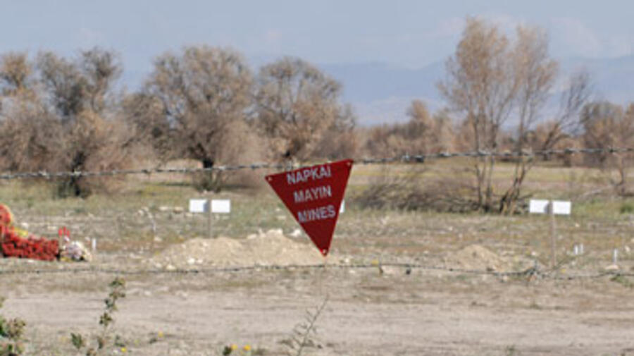 A sign at the no-man's land dividing Cyprus warns about the danger of landmines.