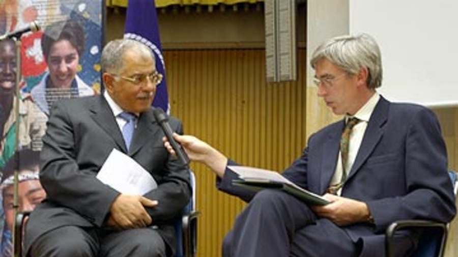 Assistant High Commissioner Kamel Morjane with the BBC's Owen Bennet-Jones, who moderated the World Scout Movement roundtable discussion in Geneva.